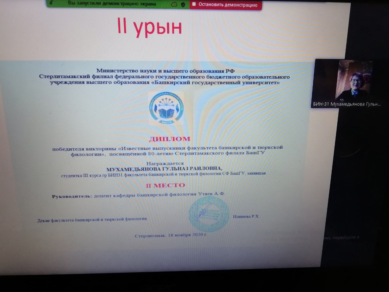 Призёрам также подарили флеш-карты от СФ БашГУ. Остальные участники викторины получили сертификаты. Мероприятие завершилось показом видеоролика Гульназ Мухамедьяновой, она участвовала в республиканском конкурсе «Новый взгляд на башкирский язык».