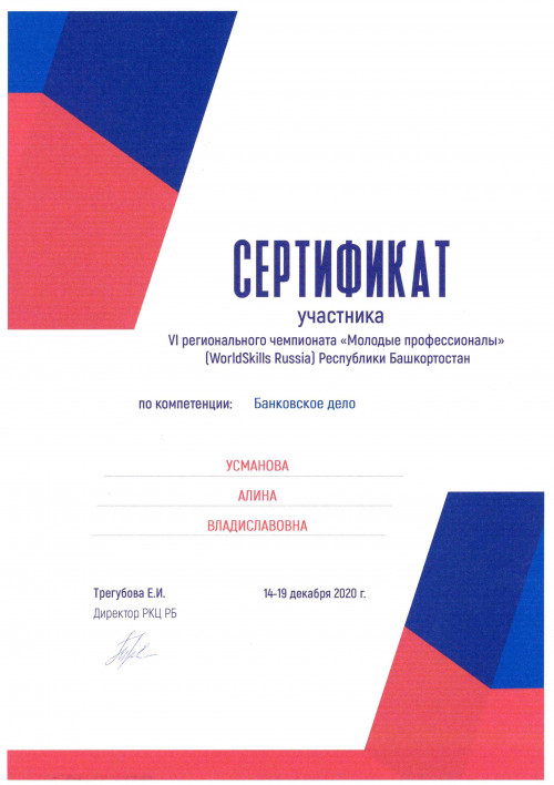 С 14 по 18 декабря в г.Сибай прошёл VI региональный чемпионат "Молодые профессионалы" (WorldSkills) по компетенции "Банковское дело". Колледж СФ БашГУ представляла Усманова Алина, студентка 3 курса специальности "Банковское дело" и преподаватель Касьянова В.О.