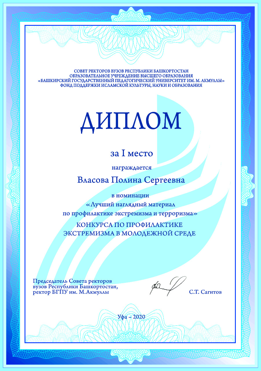 Со 2 ноября по 8 декабря 2020 года при поддержке Совета ректоров вузов Башкортостана и содействии Фонда поддержки исламской культуры, науки и образования Башкирский государственный педагогический университет им. М. Акмуллы проводил конкурс среди студентов образовательных учреждений высшего образования и среднего профессионального образования по профилактике экстремизма в молодежной среде.