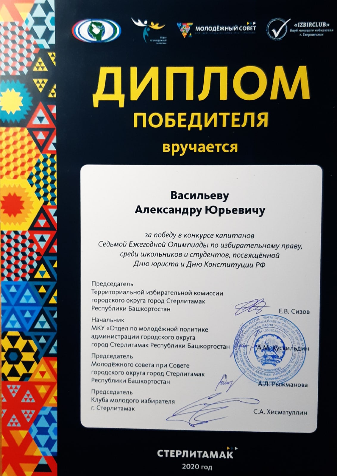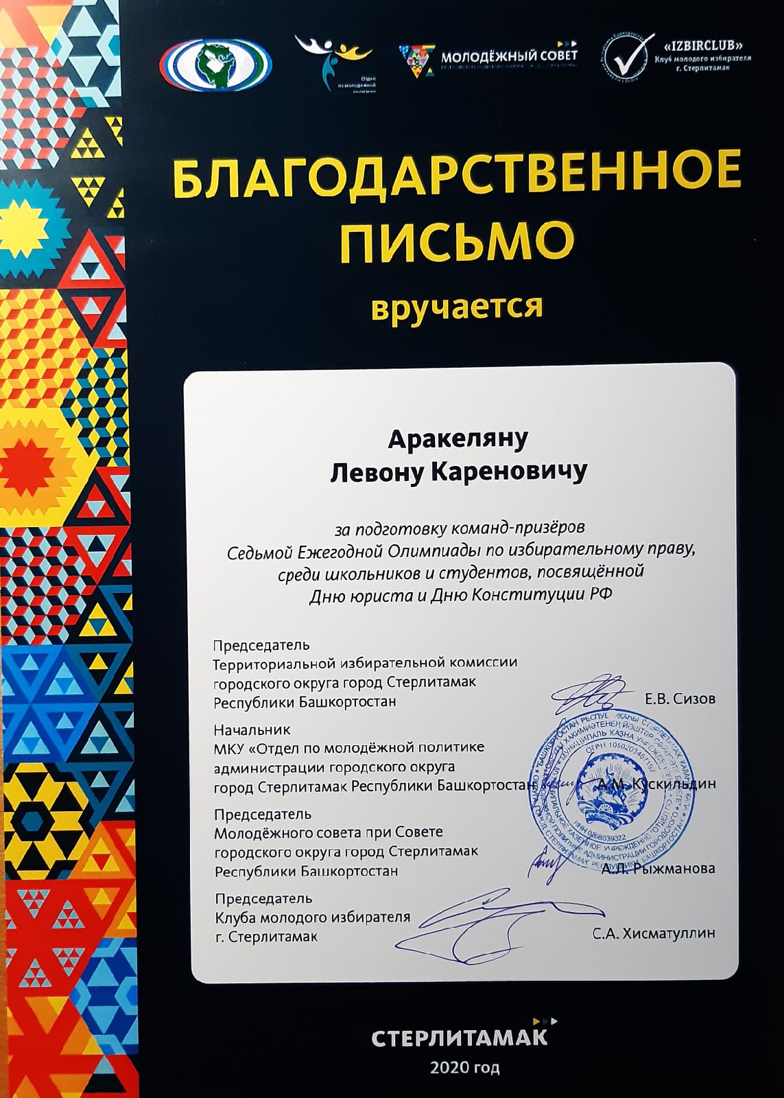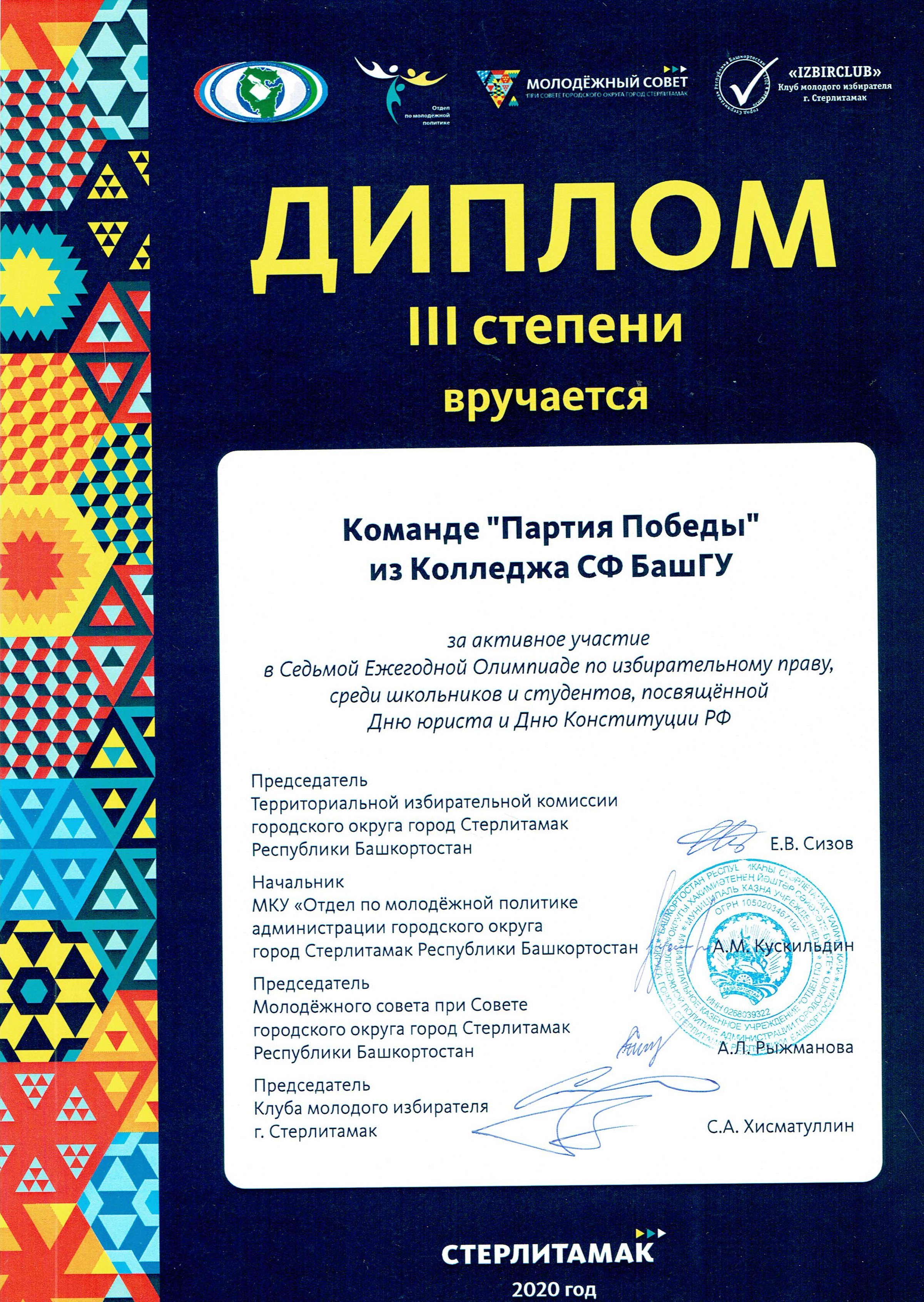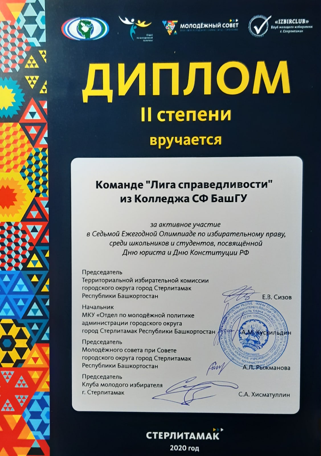 С 30 ноября по 24 декабря 2020 года студенты 2 курса специальности 40.02.01 Право и организация социального обеспечения и 3 курса специальности 40.02.03 Право и судебное администрирование колледжа СФ БашГУ под руководством преподавателя юридических дисциплин Аракеляна Левона Кареновича приняли участие в VII ежегодной олимпиаде по избирательному праву среди школьников и студентов, посвящённой Дню юриста и Дню Конституции РФ, организованной отделом по молодёжной политике администрации городского округа город Стерлитамак Республики Башкортостан, территориальной избирательной комиссией городского округа город Стерлитамак Республики Башкортостан, Молодёжным советом при Совете городского округа город Стерлитамак Республики Башкортостан.