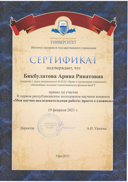 19 февраля 2021г. в г. Уфа команда студентов колледжа Стерлитамакского филиала БашГУ в составе Исмагиловой Ренаты, Ильясовой Илюзы, Филлиповой К.И. (науч. рук. Абдрахимова Л.А.), Брусенковой Аделины (науч .рук. Спиридонова Н.А.), Бикбулатовой Арины, Жуковского Арсена (науч.рук. Аракелян Л.К.), Кормаковой Анастасии (науч.рук. Амирова А.А.) приняла активное участие в конкурсе исследовательских работ Первого республиканского молодежного научного конвента «Моя научно-исследовательская работа: просто о сложном», организованном Институтом истории и государственного управления ФГБОУ ВО «БашГУ».