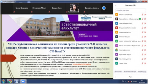 20 февраля 2021 г. на кафедре химии и химической технологии естественнонаучного факультета прошла VII Республиканская олимпиада по химии среди учащихся 9,10, 11 классов общеобразовательных школ РБ.