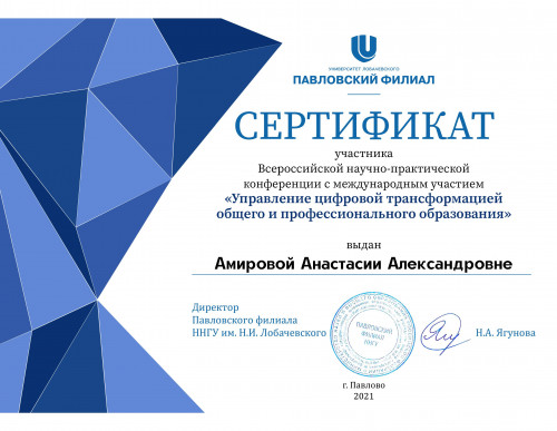 3 марта 2021 года преподаватели ПЦК юридических дисциплин Абдрахимова Л.А., Амирова А.А., Чугунова Э.А. приняли участие в работе научно-практической конференции с международным участием «Управление цифровой трансформацией общего и профессионального образования», проведенной ФГАОУ ВО «Национальный исследовательский Нижегородский государственный университет им. Н.И. Лобачевского».