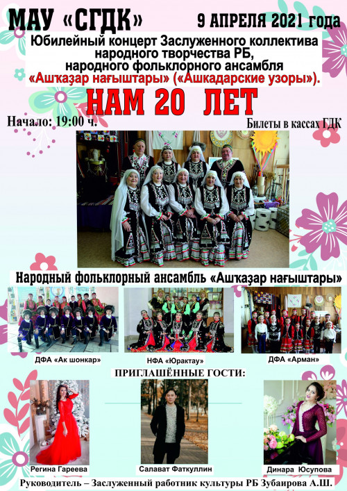 9 апреля 2021 года в 19:00 часов в ГДК (пр.Октября,35) состоится юбилейный концерт Заслуженного коллектива народного творчества РБ, народного фольклорного ансамбля «Ашкадарские узоры», (руководитель Заслуженный работник культуры РБ - Альфия Зубаирова), посвященный 20-летию творческой деятельности коллектива.