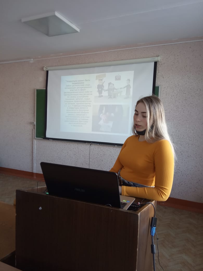 Студенты 1 курса группы ХИМ11 во время кураторского часа 06.03 провели мероприятие, посвященное борьбе с коррупцией. Разобрались с термином коррупция, видами коррупции, методами борьбы с коррупцией в России и наказанием за коррупцию. Мероприятие прошло очень живо при активном участии студентов в обсуждении.