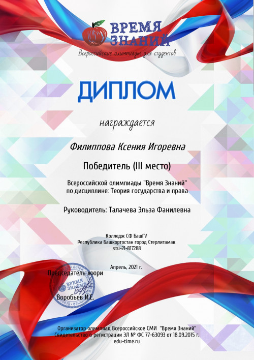 Студенты II курса специальности 40.02.01 Право и организация социального обеспечения колледжа СФ БашГУ под руководством преподавателя Талачевой Эльзы Фанилевны приняли участие во Всероссийской онлайн олимпиаде по дисциплине «Теория государства и права» на сайте международных и всероссийских конкурсов для педагогов, воспитателей и детей «Время знаний».