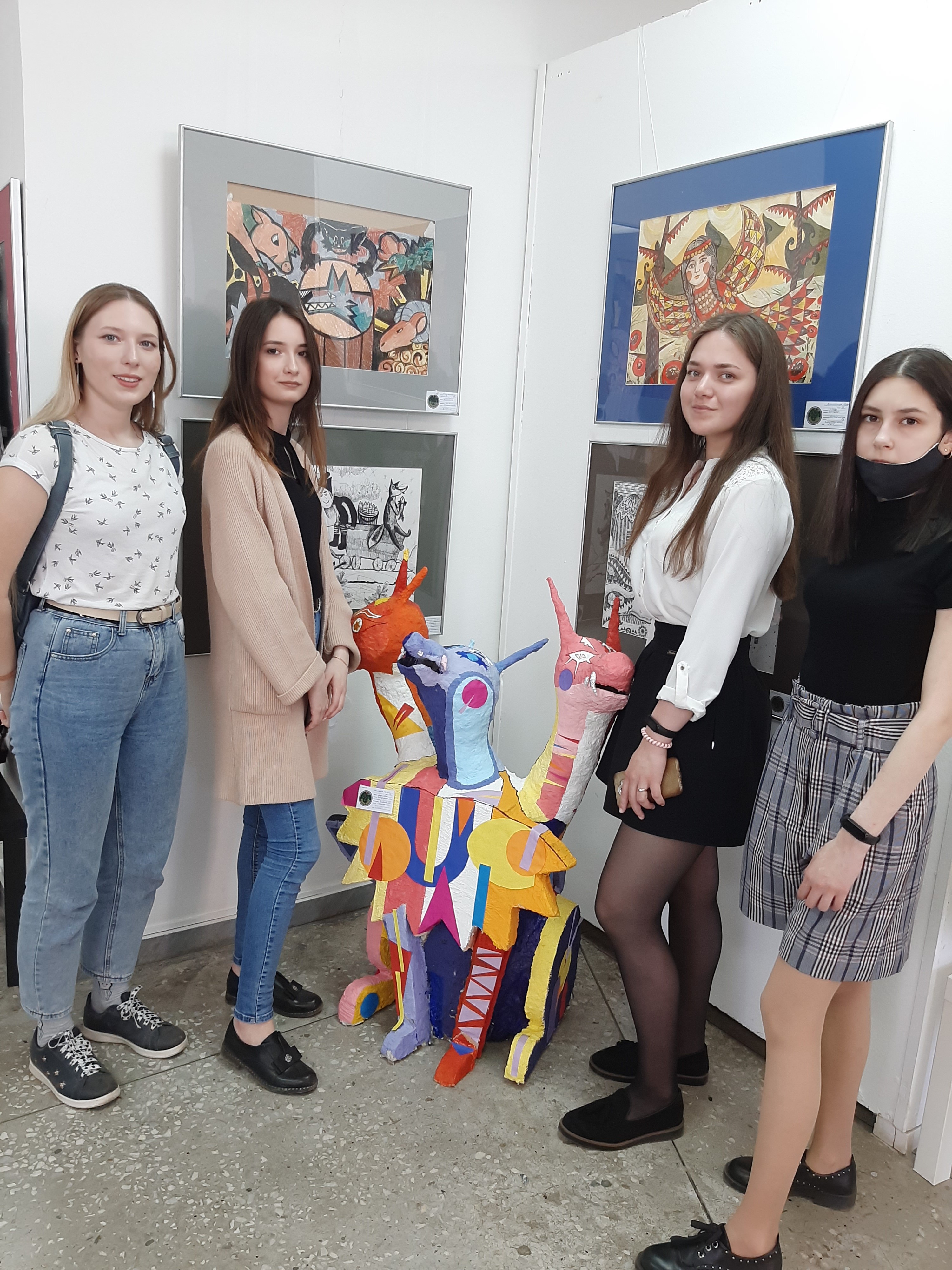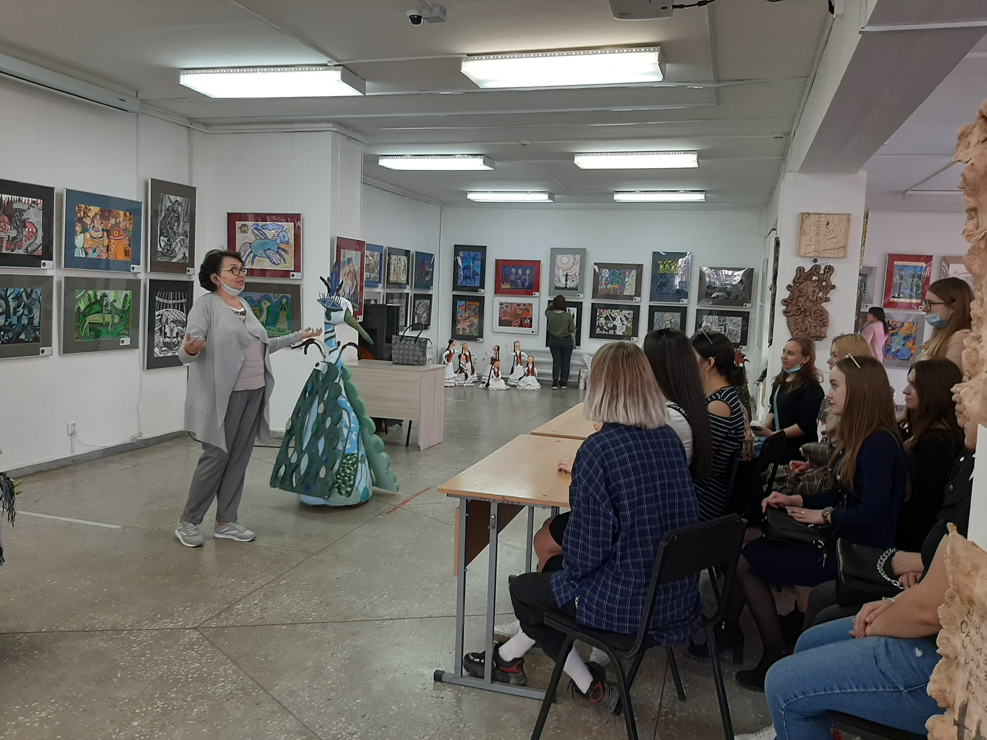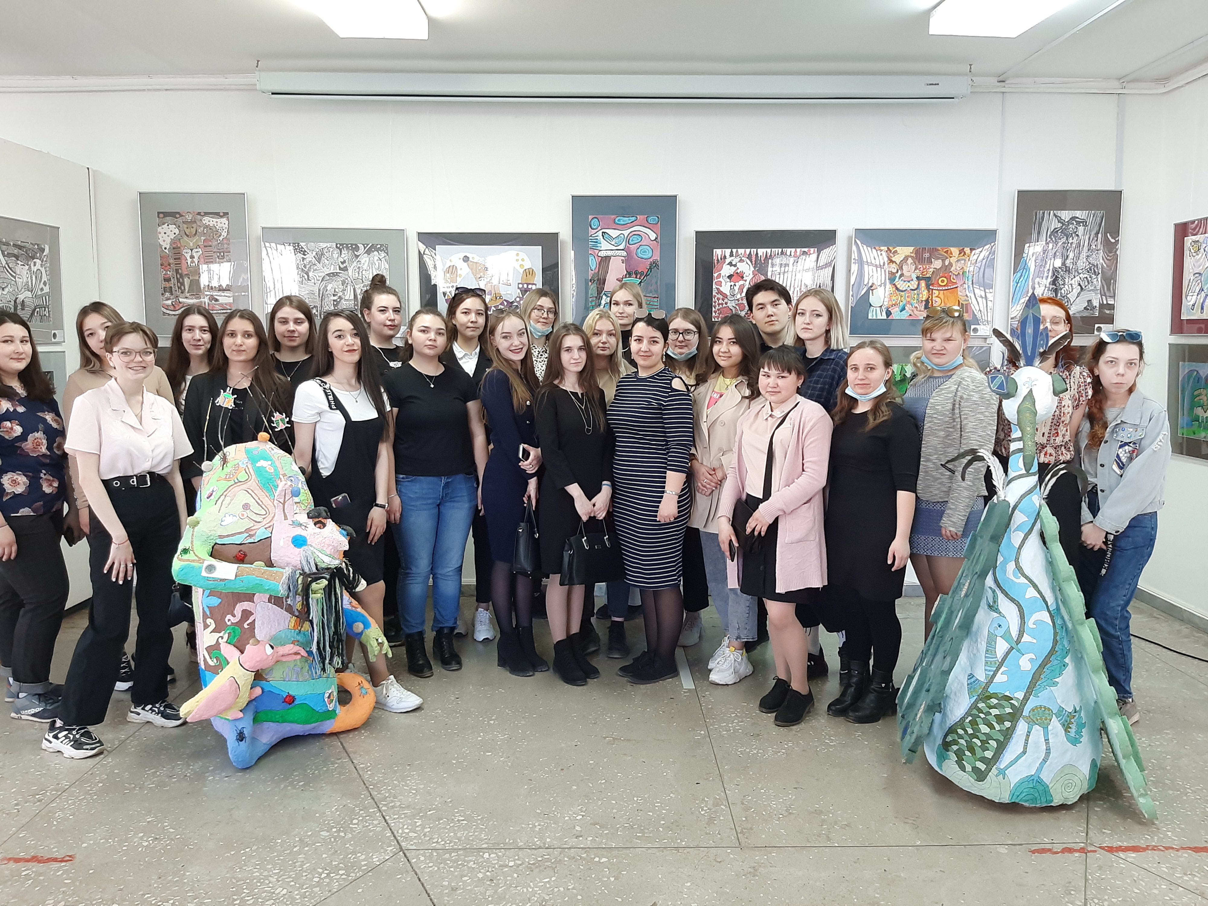Студенты с радостью и восхищением встретили знакомых героев из любимых сказок, мифов и легенд, нарисованных акварелью, гуашью, углем, цветными мелками, гелевыми ручками и фломастерами. Экскурсия была направлена развитие и популяризацию детского художественного творчества, изучение исторического наследия народов мира (мифы, легенды, сказания, эпосы), выявление и распространение инновационных направлений в преподавании изобразительного искусства, получение новых знаний в ходе занятия творчеством. Руководитель познакомила с различными техниками выполнения и рассказала студентам, что такое войлок, папье-маше, авторская текстильная кукла, керамика и бумажная пластика.