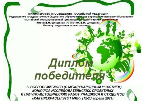 Студенты 4 курса факультета педагогики и психологии О.С. Тихонова, А.А. Малкина приняли участие во II Всероссийском (с международным участием) конкурсе исследовательских, проектных и научно-методических работ учащихся и студентов «Как прекрасен этот мир» (г. Бийск, 12-23 апреля 2021 г.).