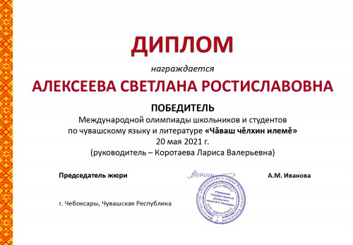 20 мая 2021 года в целях повышения мотивации и усиления интереса к изучению чувашского языка и литературы, воспитания уважительного и бережного отношения к культуре и истории родного края, развития у обучающихся творческих способностей на базе факультета русской и чувашской филологии и журналистики ЧГУ им. И.Н. Ульянова (г. Чебоксары) прошла Международная олимпиада по чувашскому языку и литературе по конкурсным направлениям «Чăваш чĕлхи – тăван чĕлхе» и «Тăван чĕлхе илемĕ».