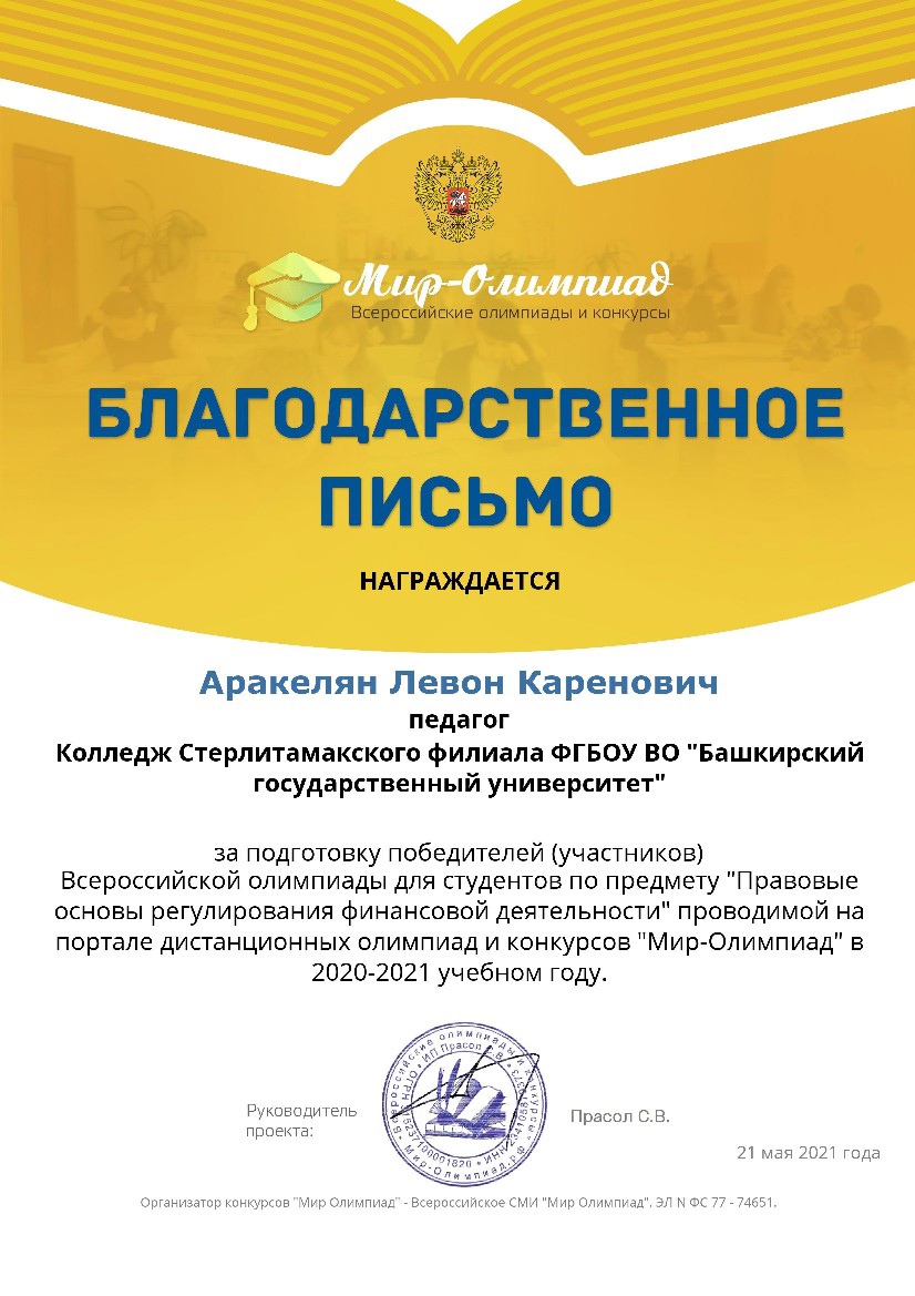 По результатам олимпиады студентка колледжа СФ БашГУ заняла I место (диплом № 58362001 от 21.05.2021).