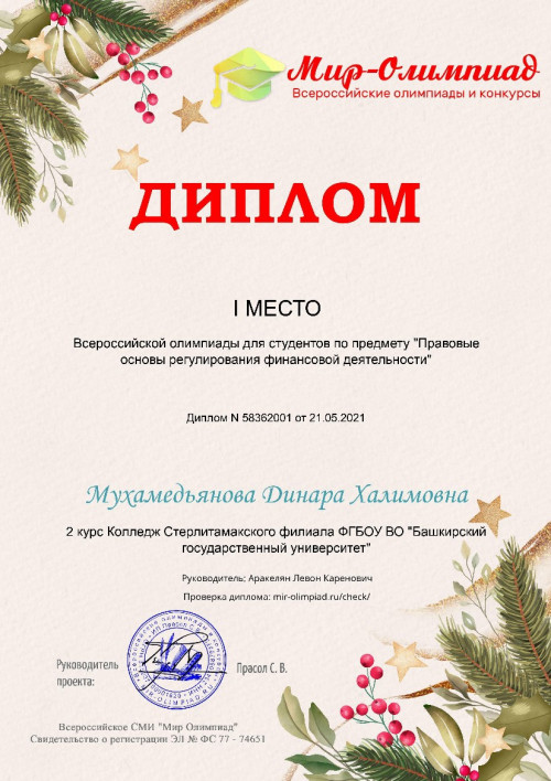 Студентка II курса колледжа СФ БашГУ специальности 38.02.06 Финансы Д.Х. Мухамедьянова (гр. 3Ф21) под руководством преподавателя юридических дисциплин Л.К. Аракеляна успешно приняла участие во Всероссийской олимпиаде для студентов по дисциплине «Правовые основы регулирования финансовой деятельности».