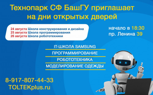 Все еще думаете, чем занять ребенка? Возникли сложности с выбором направления? Приглашаем Вас на День открытых дверей в Технопарк Стерлитамакского филиала БашГУ.