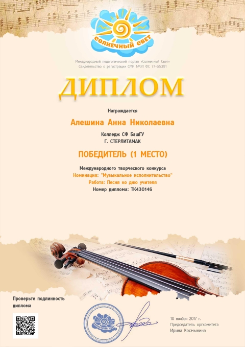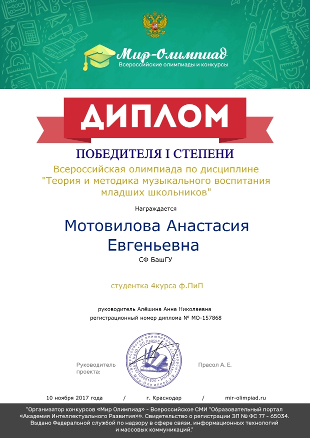 Также стоит поздравить преподавателя Алешину А.Н. с участием в международном конкурсе творческого мастерства с песней, записанной ко дню учителя "Учительский вальс" и завоеванием 1 места с песней и студентку Мотовилову А. с 1 местом в дистанционной олимпиаде по данной дисциплине.