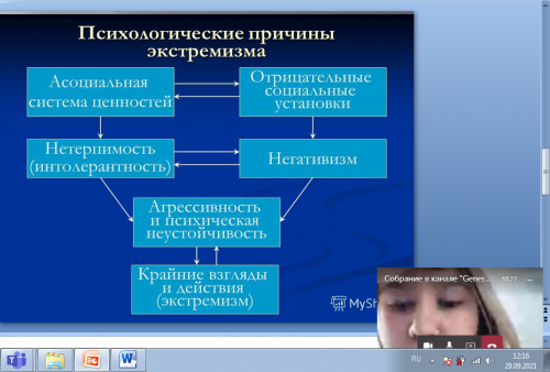 В группе ППО11 29 сентября 2021 года состоялся кураторский час на тему «Экстремизм и терроризм – проблема современности». Организатор мероприятия – кандидат психологических наук, доцент Долгова Н.Ю.