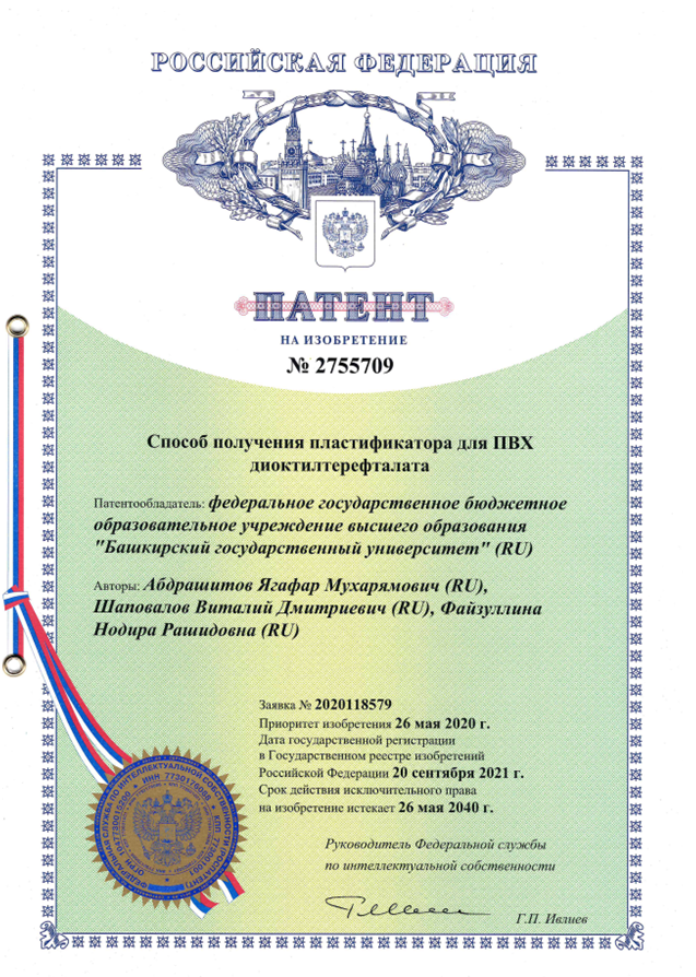 Ученые Стерлитамакского филиала Башкирского государственного университета получили патент на изобретение «Способ получения пластификатора ПВХ диоктилтерефталата» (№2755709 от 20.09.2021 г.). Авторами разработки стали д.т.н. Ягафар Мухарямович Абдрашитов, н.с. Виталий Дмитриевич Шаповалов и к.п.н., доцент Нодира Рашидовна Файзуллина.