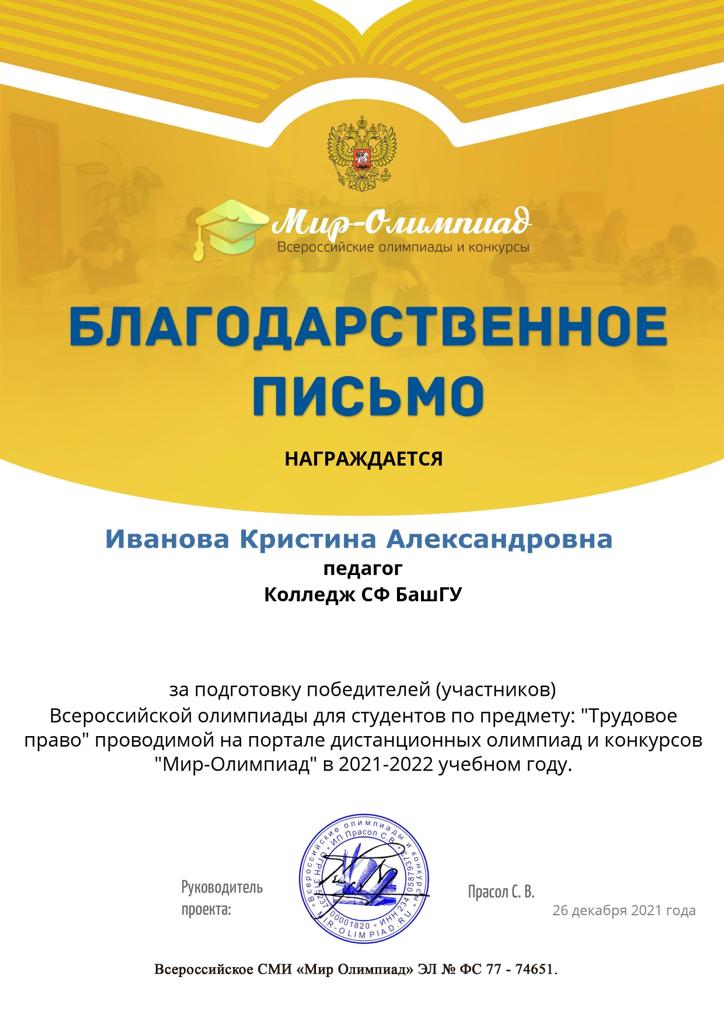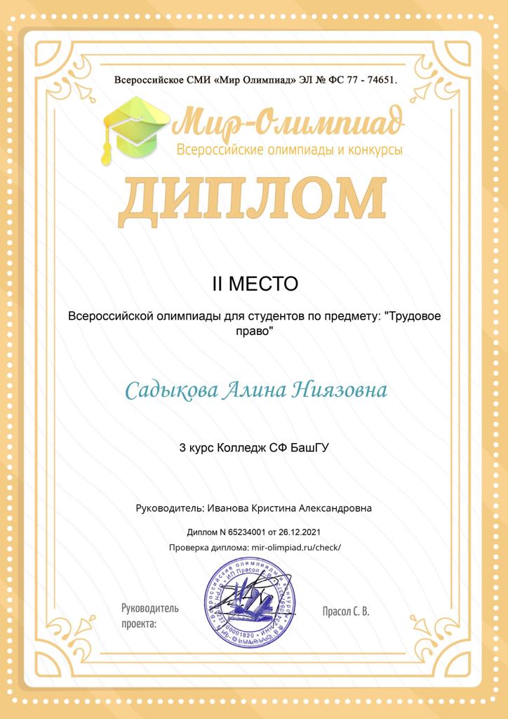 26 декабря прошла Всероссийская олимпиада «Мир Олимпиад» по дисциплине «Трудовое право». Организатором олимпиады выступило Всероссийское СМИ «Мир Олимпиад». Под руководством преподавателя колледжа СФ БашГУ Ивановой К.А. в олимпиаде приняла участие студентка III курса специальности «Право и судебное администрирование» Садыкова Алина Ниязовна. По результатам олимпиады Садыкова А.Н. была награждена дипломом победителя II степени, а руководитель благодарственным письмом.