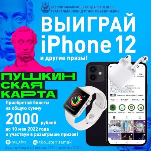 С 1 февраля по 10 мая 2022 г. Стерлитамакское государственное театрально-концертное объединение проводит акцию среди держателей Пушкинской карты. Главный приз – Iphone 12.