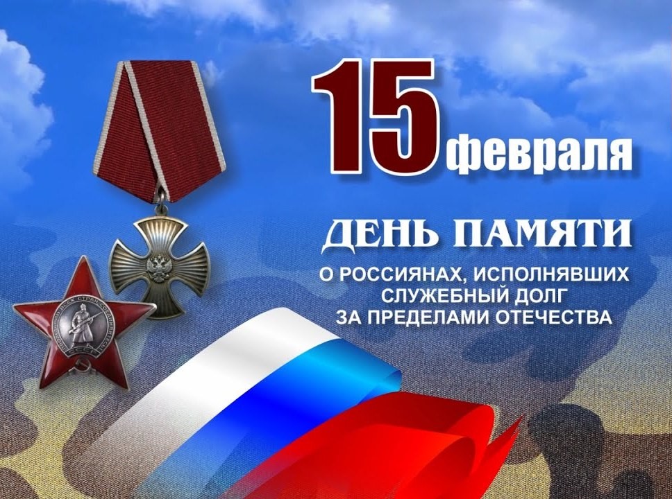 15 февраля в России отмечается День памяти о россиянах, исполнявших служебный долг за пределами Отечества. Это военнослужащие, сотрудники госбезопасности, советники, которые принимали участие в вооруженных конфликтах, обеспечивая защиту интересов страны за рубежом. Дата приурочена к выводу советских войск из Афганистана 15.02.1989 г.