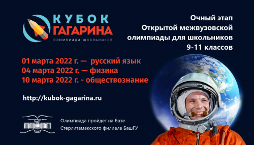 С 1 по 10 марта 2022 года на базе Стерлитамакского филиала БашГУ (пр. Ленина, 49) пройдёт очный этап Открытой межвузовской олимпиады для школьников 9-11 классов на Кубок имени Ю.А. Гагарина:
