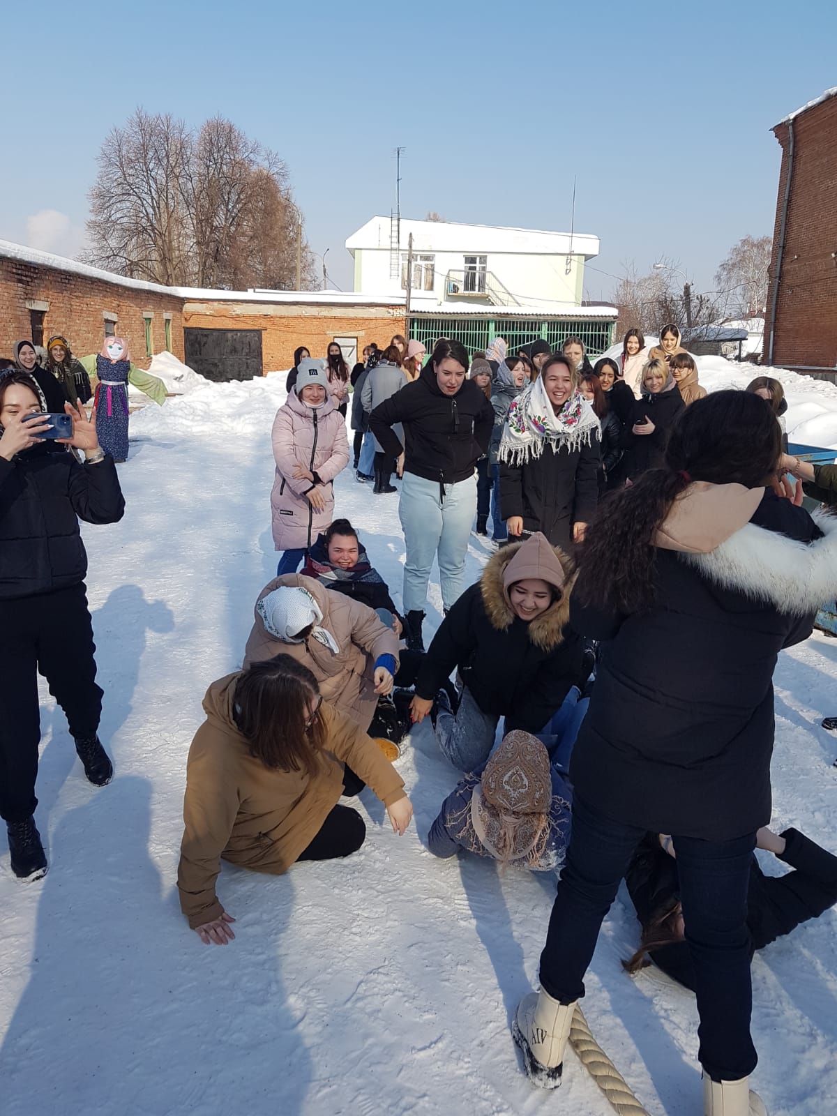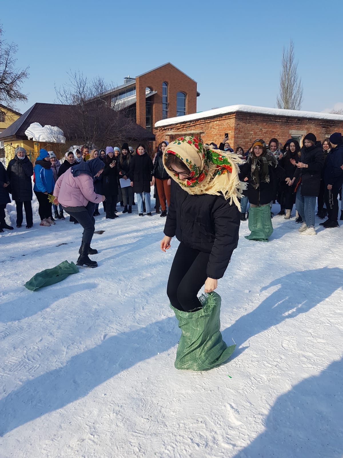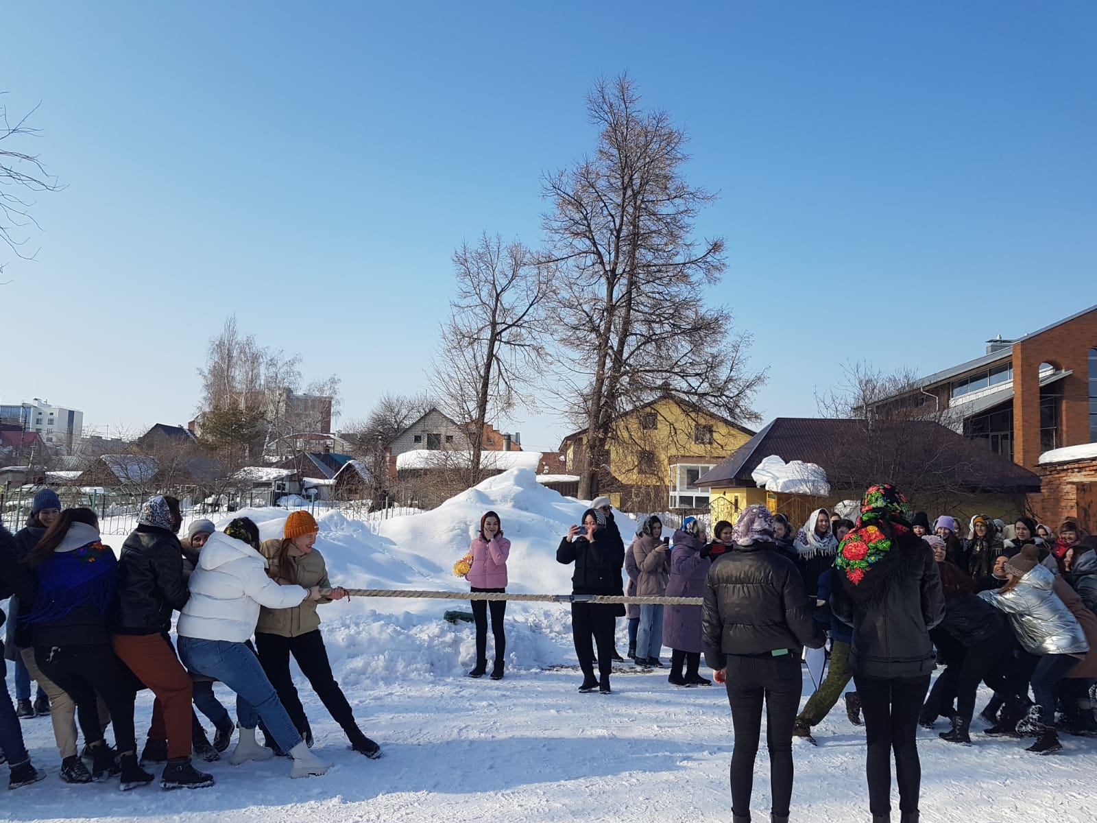 Озорные скоморохи вовлекли студентов и преподавателей в весёлые гуляния и игры: тянуть канаты, бегать в мешках, ловить в «проруби» рыбу, заплетать длинную косу из ленточек, петь, водить хороводы и др. В завершении праздничной программы по многовековой традиции попрощались с чучелом Масленицы, как символ ухода зимы и наступления солнечных весенних дней.