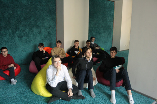 Помимо этого перед школьниками выступили студенты 3 курса Евгений Семенов и Вадим Хазеев. Они поделились опытом участия в проекте УМНИК, рассказали о том, как собрать команду и выиграть грант на 500 000 рублей. Также ребята продемонстрировали на экране проекты, над которыми сейчас работают.