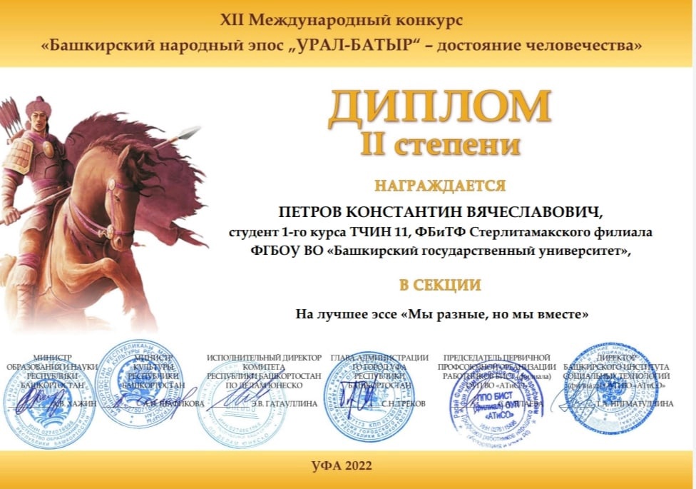 Стерлитамакский филиал Башкирского государственного университета на этом конкурсе представил студент I курса чувашского отделения факультета башкирской и тюркской филологии Константин Петров. Он вошел в число победителей в номинации "Лучшее эссе" на тему "Мы разные, но мы вместе" (руководитель – канд. филол. наук, доцент Коротаева Л.В.).