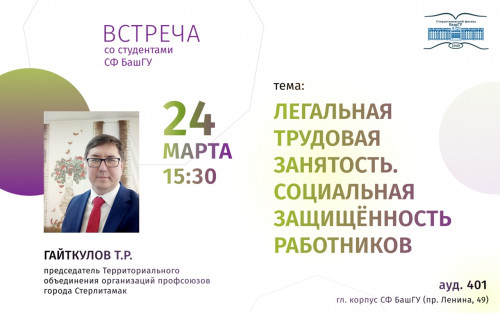 24 марта в Стерлитамакском филиале БашГУ перед студентами выступит председатель Территориального объединения организаций профсоюзов города Стерлитамак Т.Р. Гайткулов с открытой лекцией "Легальная трудовая занятость. Социальная защищённость работников".
