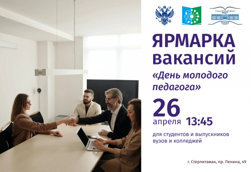 26 апреля 2022 г. в 13:45 пройдет ежегодная ярмарка вакансий «День молодого педагога» для студентов предвыпускных, выпускных курсов выпускников Стерлитамакского филиала БашГУ.