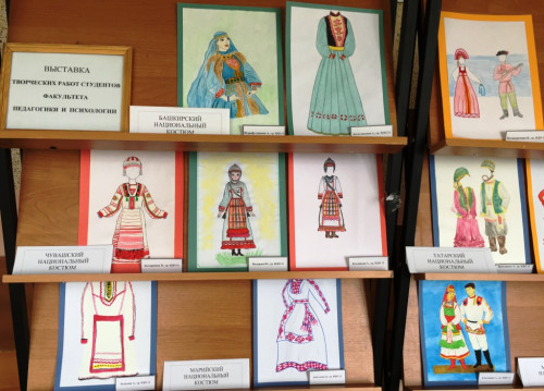 В своих рисунках студенты представили национальные костюмы некоторых народов, проживающих в Республике Башкортостан: русский народный костюм (Великоречина Я., Ирназарова А.), башкирский народный костюм (Богословская А., Лазарева А., Семенова А., Шарафутдинова А.), татарский народный костюм (Бикташев В., Ирназарова А., Панова М.), чувашский народный костюм (Батыршина Н., Козлицкая А., Федорова Ю.), мордовский народный костюм (Ахметшина А., Галиева В.), марийский народный костюм (Аязгулова Д., Залилова А.).