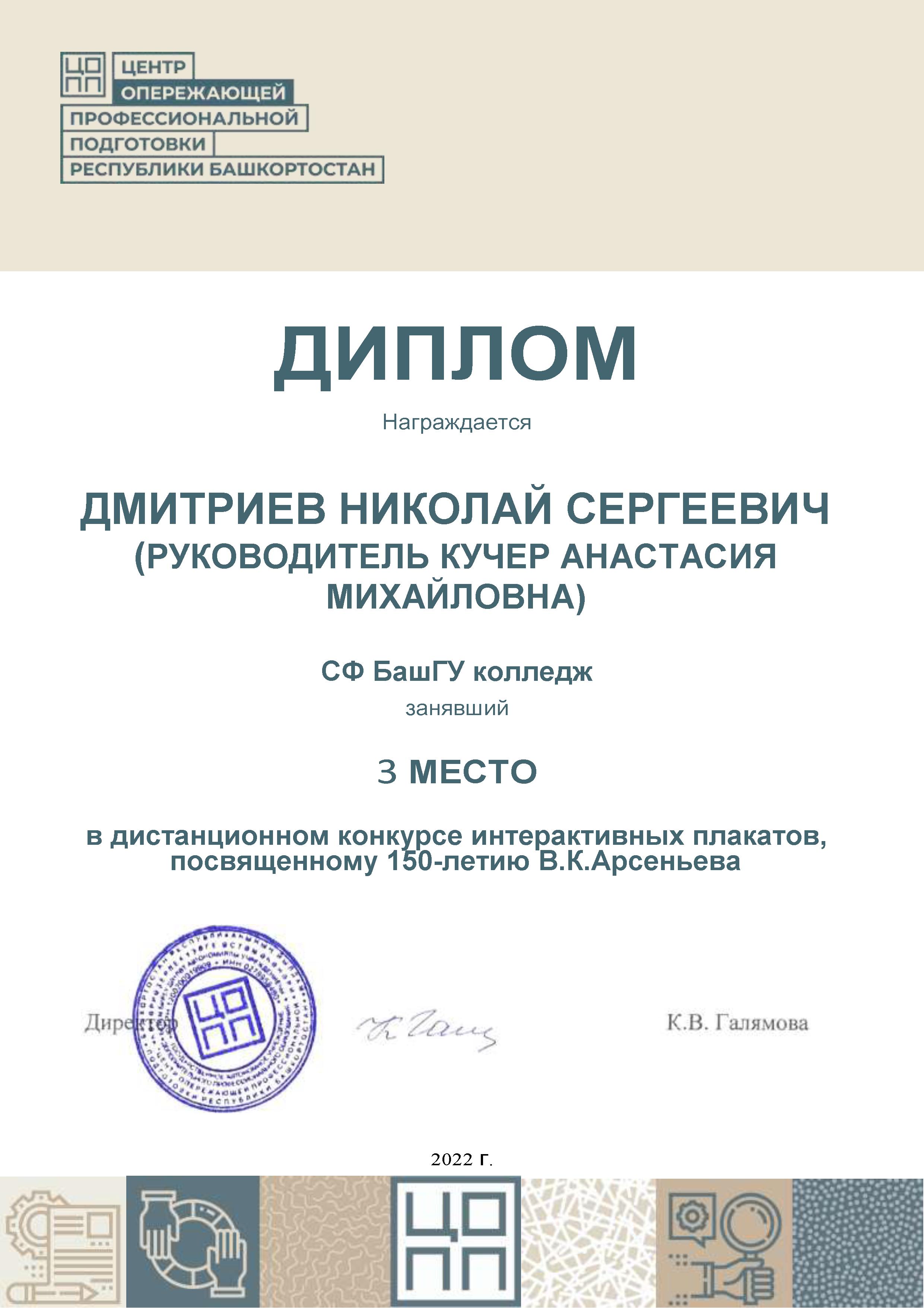 10 мая 2022 года были подведены итоги дистанционного конкурса интерактивных плакатов среди обучающихся профессиональных образовательных организаций Республики Башкортостан, посвященного 150-летию со дня рождения исследователя Дальнего Востока и поэта-прозаика Арсеньева Владимира Клавдиевича.