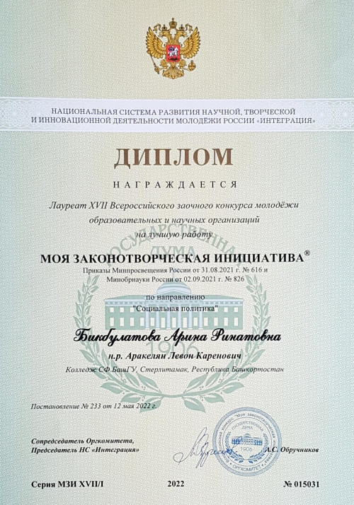 В период с 01.01.2022 по 19.05.2022 года под научным руководством преподавателя юридических дисциплин Аракеляна Левона Кареновича студентка 2 курса колледжа СФ БашГУ специальности 40.02.01 Право и организация социального обеспечения Бикбулатова Арина Ринатовна приняла участие и стала лауреатом заочного тура XVII Всероссийского конкурса молодежи образовательных учреждений и научных организаций на лучшую работу «Моя законотворческая инициатива» по направлению «Социальная политика».