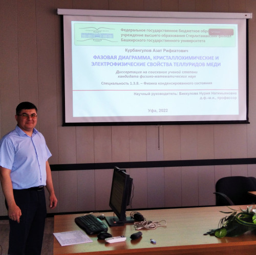 15 июня 2022 года в Уфе состоялась защита кандидатской диссертации старшего преподавателя кафедры общей и теоретической физики Курбангулова Азата Рифкатовича на тему: «Фазовая диаграмма, кристаллохимические и электрофизические свойства теллуридов меди» по специальности 1.3.8. - физика конденсированного состояния.
