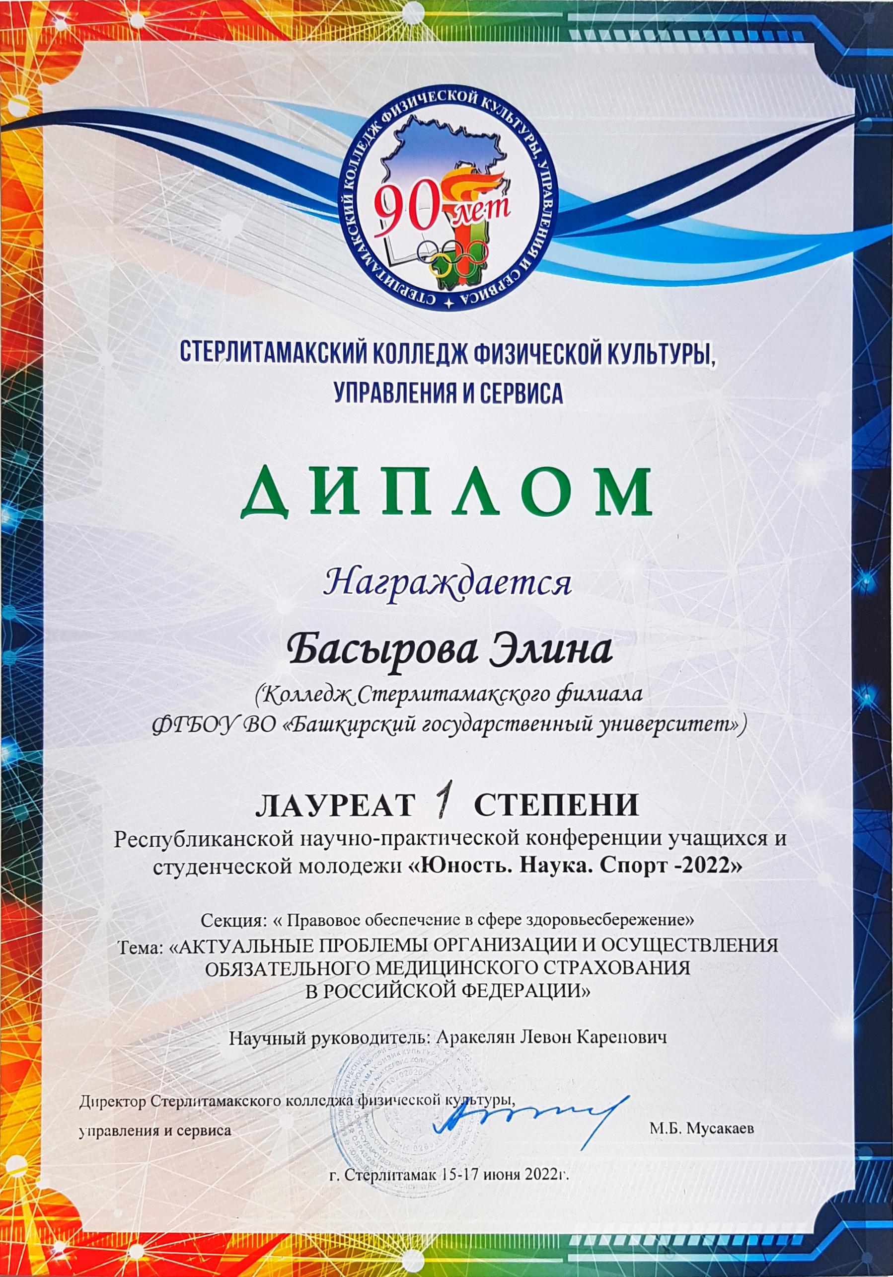 Студентка 2 курса колледжа СФ БашГУ Элина Басырова приняла участие в Республиканском конкурсе исследовательских работ учащихся и студентов «Юность, Наука, Спорт» по направлению «Правовое обеспечение в сфере здоровьесбережения».