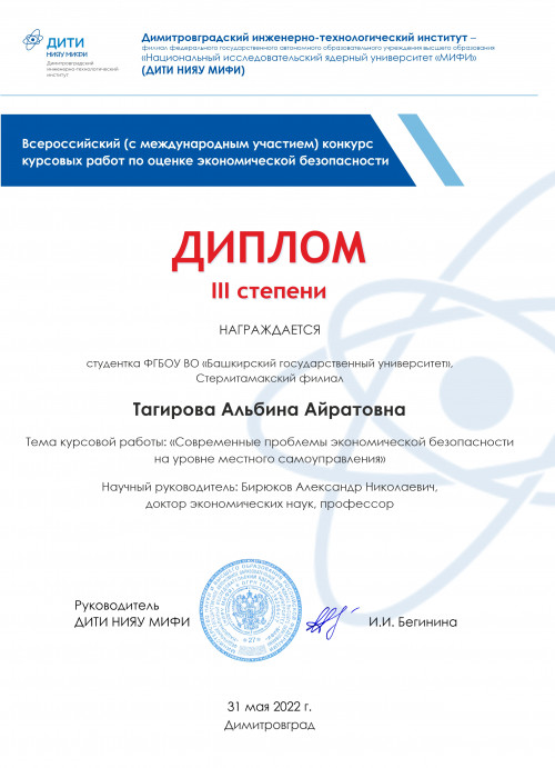 Подведены итоги Всероссийского (с международным участием) конкурса курсовых работ по оценке экономической безопасности. Организатором проекта выступил Димитровградский инженерно-технологический институт НИЯУ МИФИ.