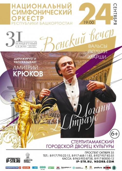 24 сентября в 19.00 ч. на сцене Городского дворца культуры г. Стерлитамака состоится роскошный гала-концерт, который погрузит зрителей в праздничную атмосферу венских балов. Музыкальная программа концерта выдержана в великолепном венском стиле – искромётном, бравурном, блестящем танцевальном движении, которое возглавит музыка короля венского вальса – великого Иоганна Штрауса. Дирижирует и рассказывает – главный дирижер оркестра, заслуженный артист РБ Дмитрий Крюков.