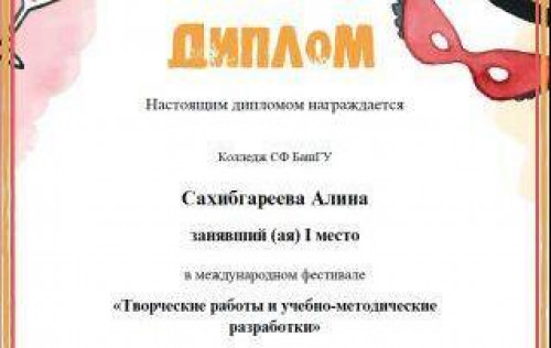 Студентка группы К3НО31 колледжа СФ БашГУ Сахибгареева Алина под руководством кандидата педагогических наук, доцента Александровой Л.М. заняла I место в Международном фестивале «Творческие работы и учебно-методические разработки». Фестиваль проходил в г. Санкт-Петербурге в заочной и очной формах. На конкурсе была представлена методическая разработка по теме «Художественно-эстетическое воспитание на материале русских народных сказок при организации внеурочной деятельности» и творческая работа из папье-маше (персонажи сказки «Теремок»).