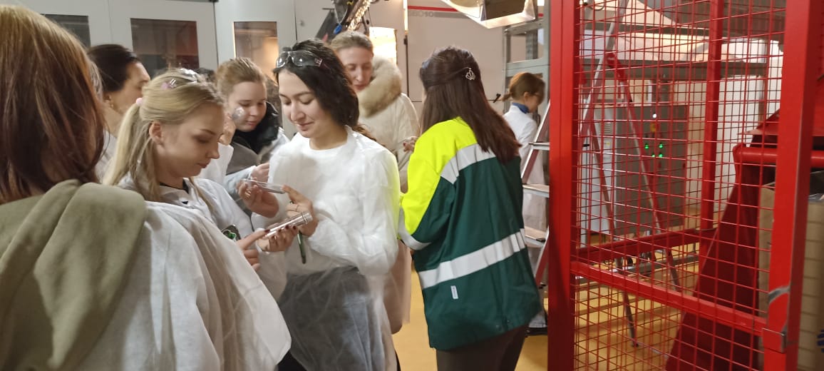 Перед началом экскурсии студенты переоделись в спец. комплекты – халаты, обувь и очки. Айгуль Сенченко познакомила студентов с историей завода: по фотоэкспозициям рассказала о развитии предприятия, о первом директоре и коллективе, об ассортименте выпускаемой продукции. Далее экскурсовод сопроводила ребят на линию производства в варочный цех, где они увидели процесс варки сусла в больших металлических емкостях. Также участники встречи увидели этап технологического процесса выдува бутылок ПЭТ из преформы (миниатюрные заготовки будущих бутылок), которые потом получили на память в качестве презента. С конечным этапом технологического процесса ребята познакомились в цехе розлива, где продукция готовится к отправке в магазины.