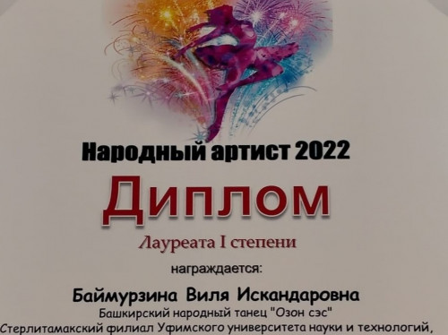 В период с 13.11.2022 по 29.12.2022 г. проходил Всероссийский Онлайн конкурс-фестиваль «Народный артист 2022». Организаторы: Министерство культуры Российской Федерации, Союз талантов России, Комитет по сохранению нематериального культурного наследия РФ Юнеско. Цель: привлечение детей и молодежи, взрослых участников РФ к активному творчеству, создание условий для творческой самореализации исполнителей и их социальной адаптации в сфере культуры и др.