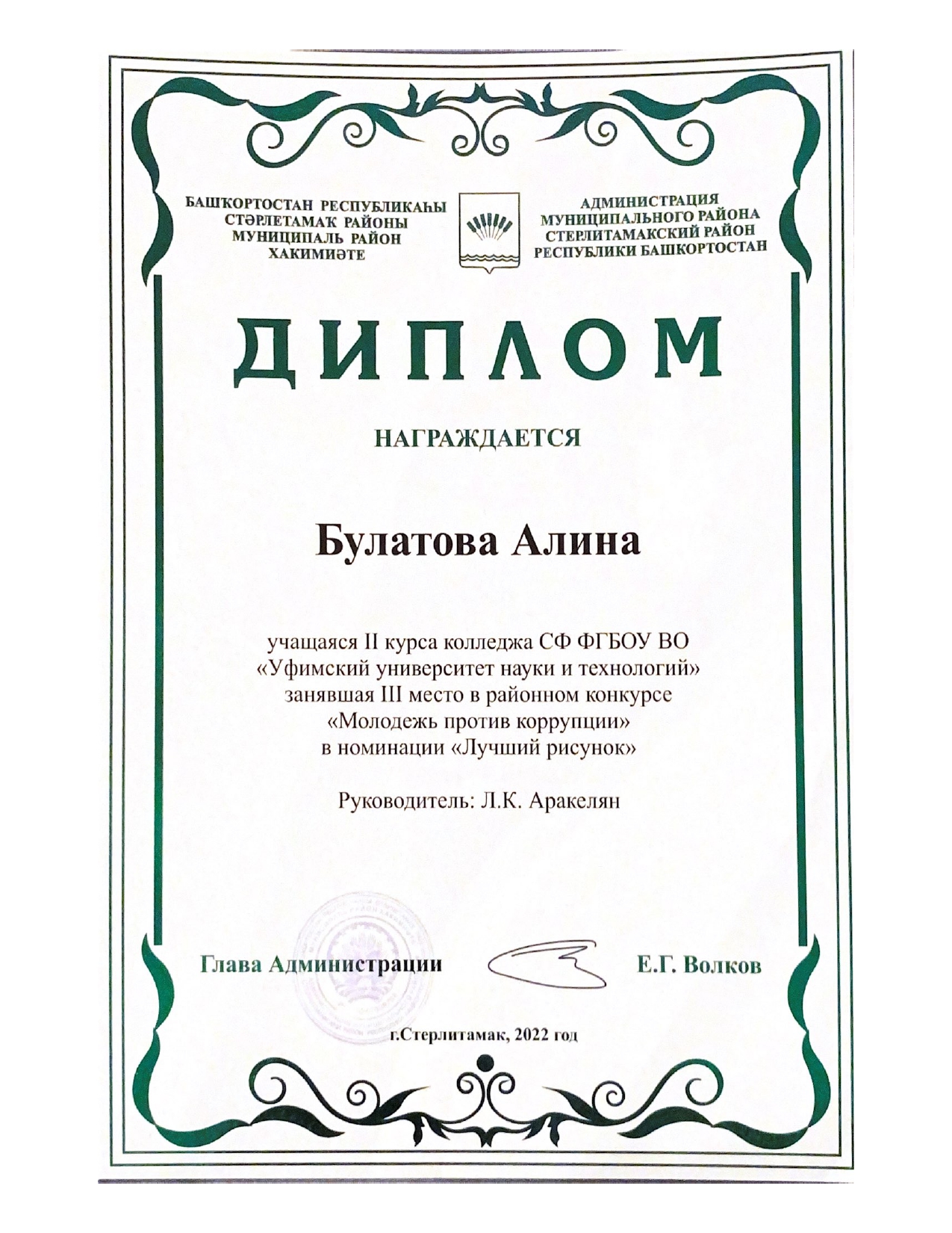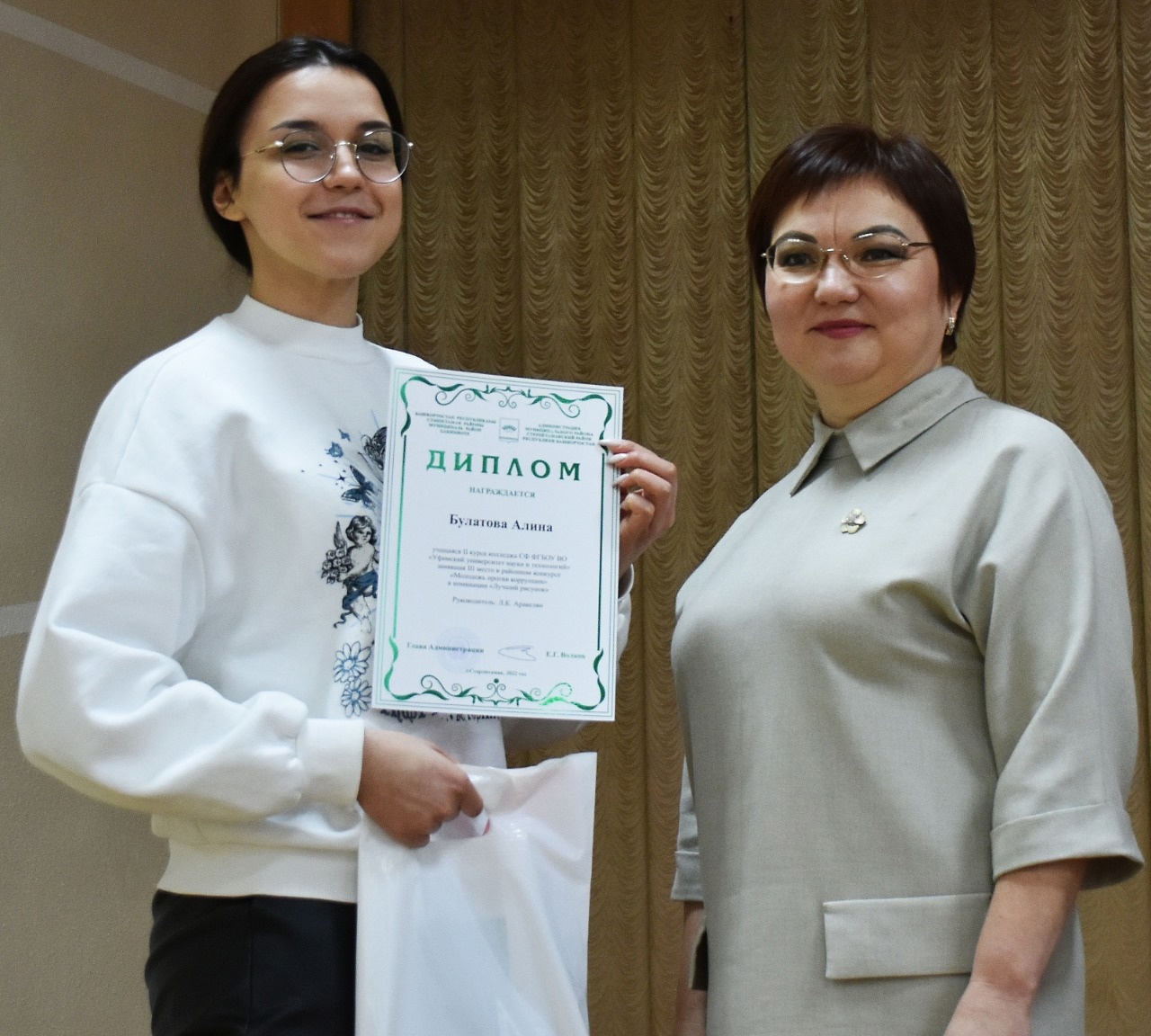 26 января 2023 года в Администрации муниципального района Стерлитамакский район Республики Башкортостан проведено торжественное награждение победителей и призеров конкурса. Студентке второго курса колледжа СФ УУНиТ специальности 40.02.01 Право и организация социального обеспечения Алине Айратовной Булатовой были вручены диплом III степени и памятные подарки за победу в номинации «Лучший рисунок».