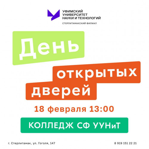 18 февраля 2023 года в 13.00 колледж СФ Уфимского университета науки и технологий проведет первый «День открытых дверей» в 2023 году! В этот день мы расскажем: