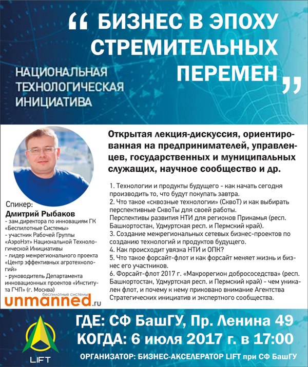 6 июля в 17.00 в СФ БашГУ он выступит с открытой лекцией-дискуссией «Бизнес в эпоху стремительных перемен». Эксперт расскажет о встраивании предпринимательства в Национальную технологическую инициативу, появлении межрегиональных проектов по созданию технологий и продуктов будущего. Лекция организована бизнес-акселератором LIFT СФ БашГУ.
