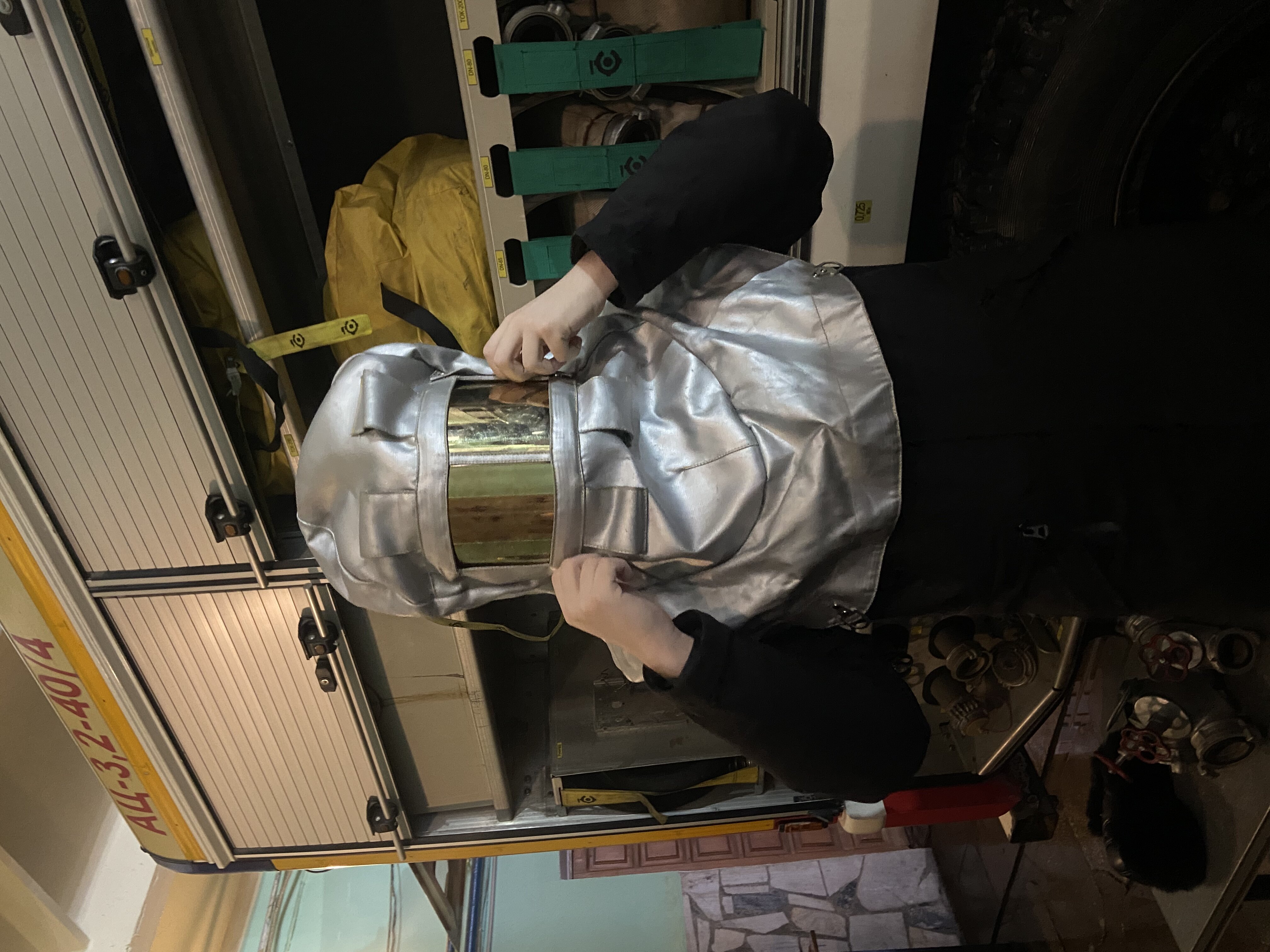 Также участникам экскурсии была предоставлена возможность примерить обмундирование и испытать на себе «Дыхательный аппарат со сжатым воздухом», посмотреть бытовые и спортивные условия пожарных.