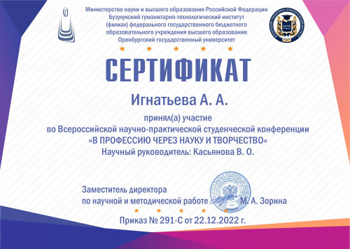 Студентка колледжа СФ УУНиТ группы 3БД31 специальности 38.02.07 Банковское дело Игнатьева А.А. также приняла активное участие в данной конференции под руководством преподавателя колледжа экономических дисциплин Касьяновой В.О. и награждена сертификатом.