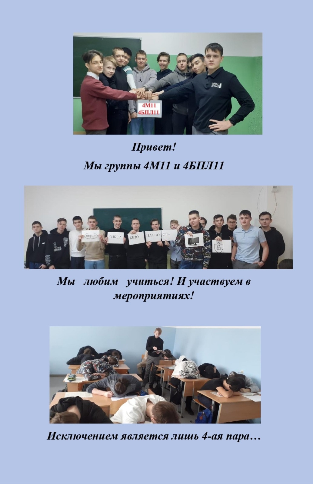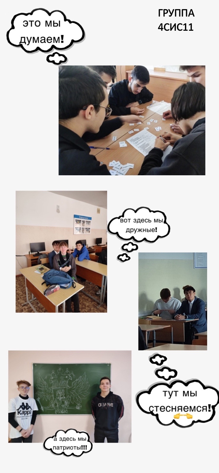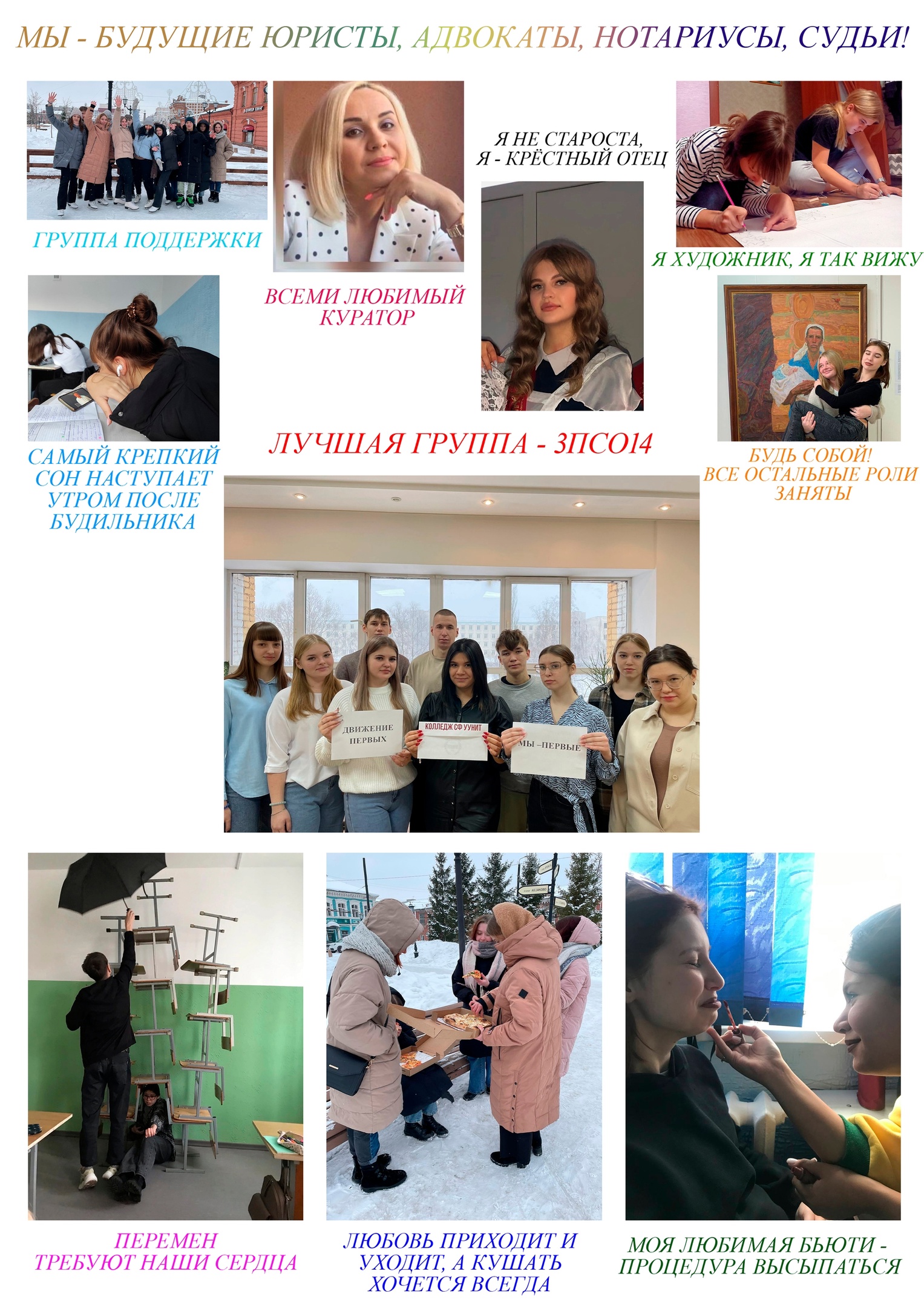 В первый день квеста было организованно голосование за самый лучший коллаж, который был визитной карточкой группы! Креативные, забавные, веселые, милые, интересные, серьезные, обаятельные и искренние – это наши студенты, которые в первый день квеста «ПЕРВОКЛАССНАЯ группа колледжа» громко заявили о себе, приветливо улыбаясь с коллажей!