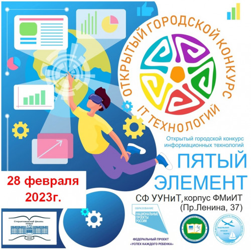 28 февраля 2023 года в 14.00 в корпусе факультета математики и информационных технологий СФ УУНиТ (Пр.Ленина 37) состоится Открытый городской конкурс информационных технологий «Пятый элемент», посвященный Году педагога и наставника.