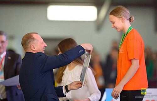 На фото министр физической культуры и спорта Оренбургской области Олег Иванович Панькин награждает Анну Летунову, студентку группы 3СА-11 Колледжа Стерлитамакского филиала УУНиТ.