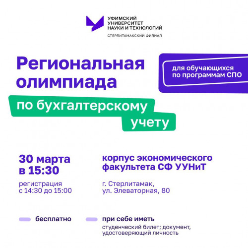 30 марта 2023 года кафедра бухгалтерского учета и аудита ФГБОУ ВО СФ УУНиТ проводит ежегодную региональную олимпиаду по бухгалтерскому учету для обучающихся по образовательным программам среднего профессионального образования.