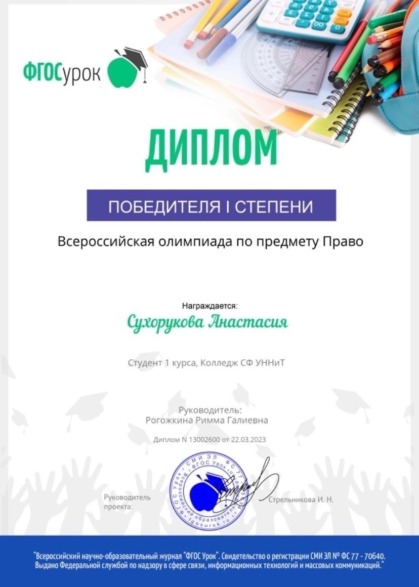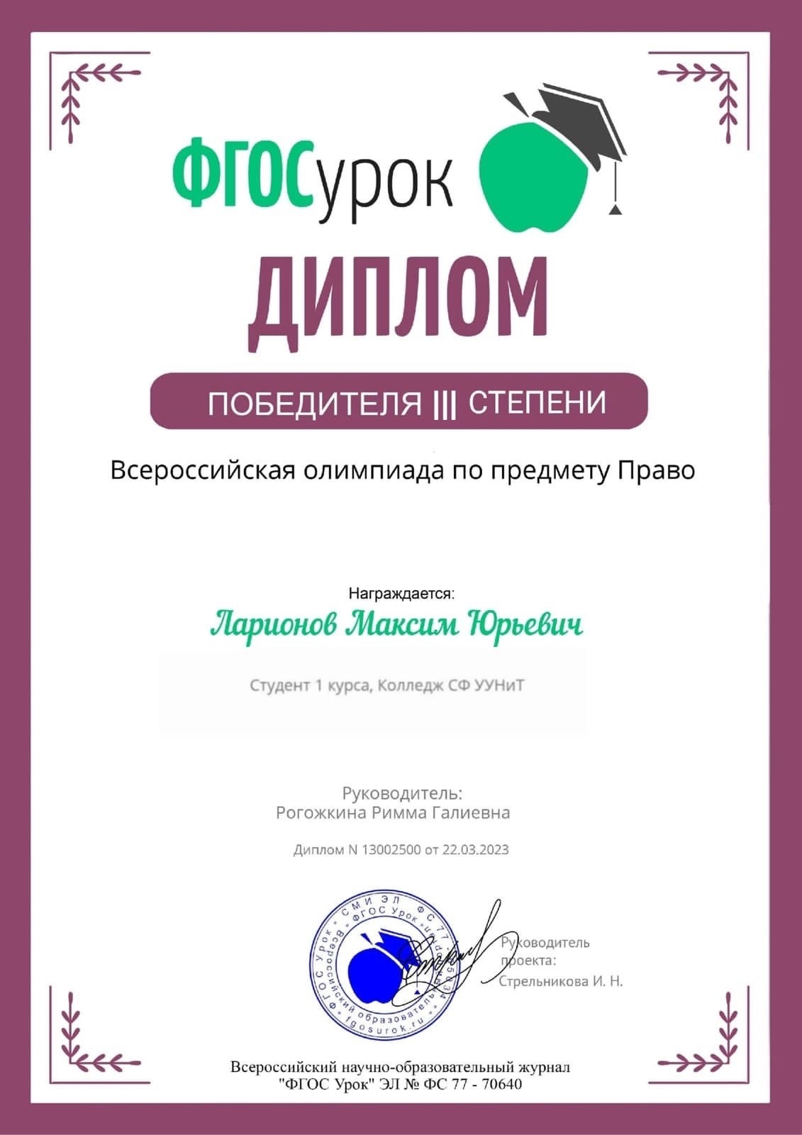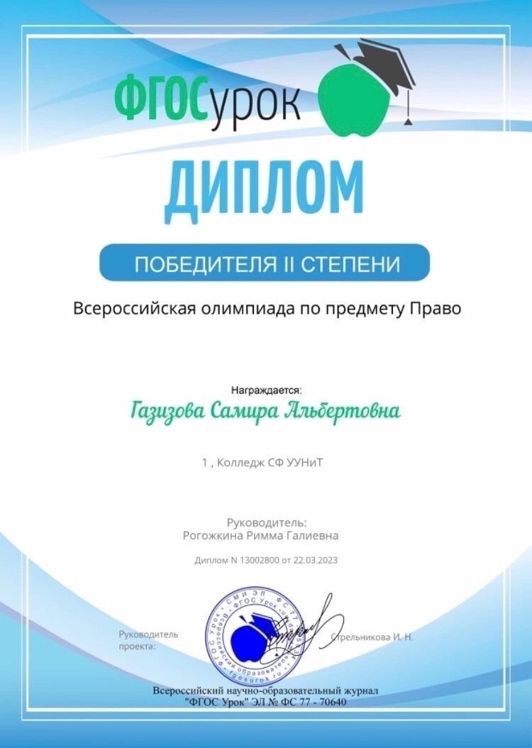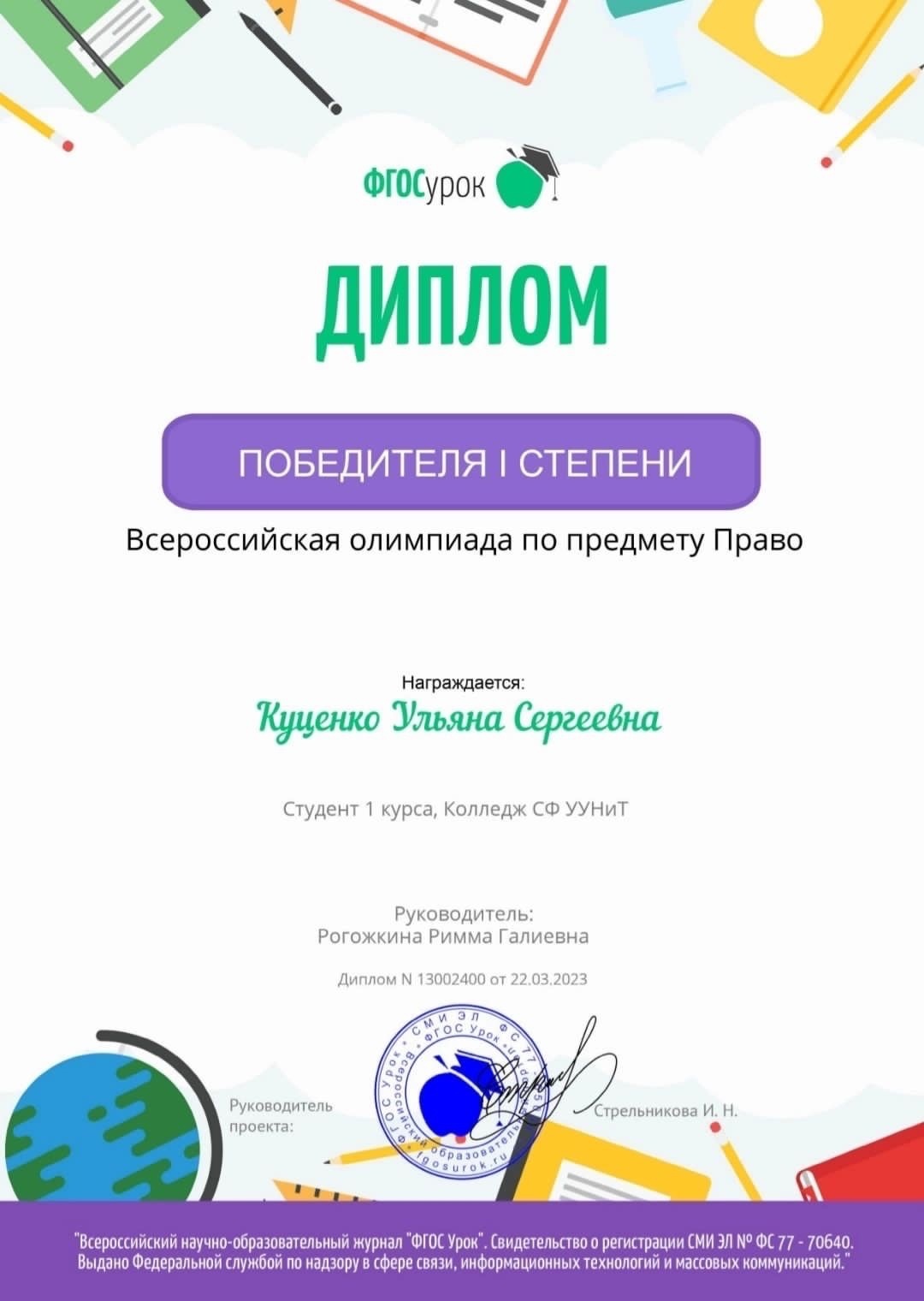 В рамках недели ПЦК юридических дисциплин студенты 1 курса колледжа СФ УУНиТ специальности 40.02.01 Право и организация социального обеспечения под руководством преподавателя 1 категории Рогожкиной Риммы Галиевны приняли участие во Всероссийской олимпиаде для студентов по дисциплине «Право».