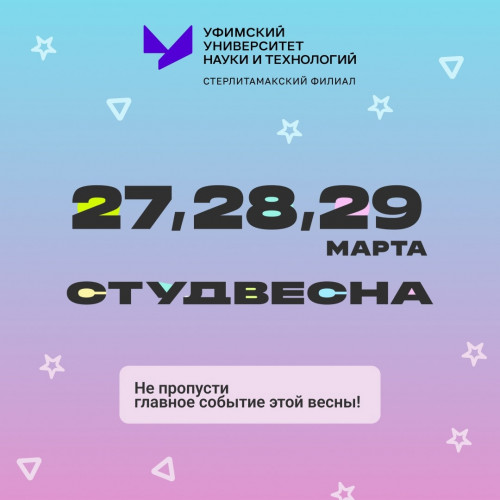 Не стройте планы на 27, 28 и 29 марта, потому что в эти дни вам будет чем заняться - мы ждем вас на выступлениях факультетов нашего Стерлитамакского филиала УУНиТ . Запоминай дату, время и приходи поддержать участников: