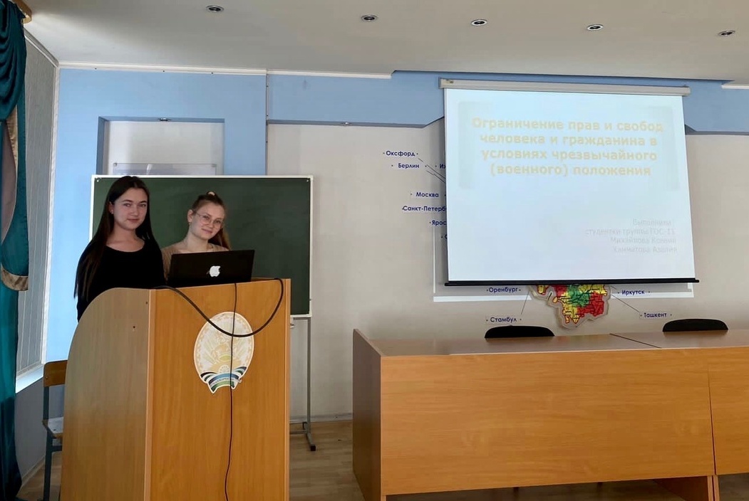 Ограничение прав и свобод человека и гражданина в условиях чрезвычайного (военного) положения в своём выступлении осветили Михайлова Ксения и Хамматова Азалия.
